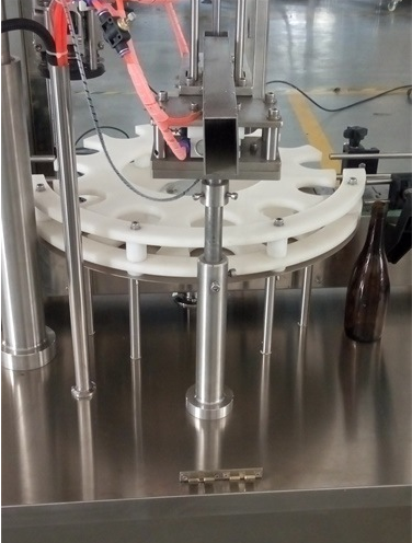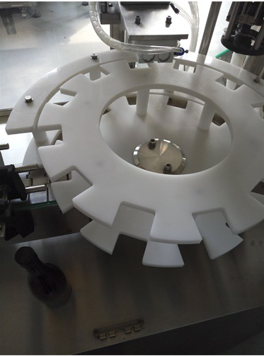 1,全自動(dòng)液體灌裝壓塞鎖蓋一體機(jī)采用圓盤式理瓶,自動(dòng)進(jìn)瓶;